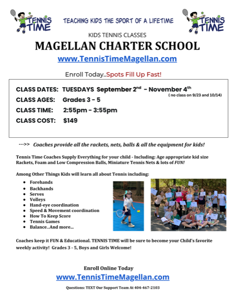 Students have fun while learning forehands, backhands, serves, tennis coordination, footwork, and so much more! The fall session begins September 2nd and runs 8 weeks, meeting on Tuesdays, 2:55-3:55pm. Tuition is $149. Complete details on the Tennis Time program can be found HERE. To register, visit tennistimemagellan.com. Email Coach Robin at ttcoachrobin@gmail.com with questions.