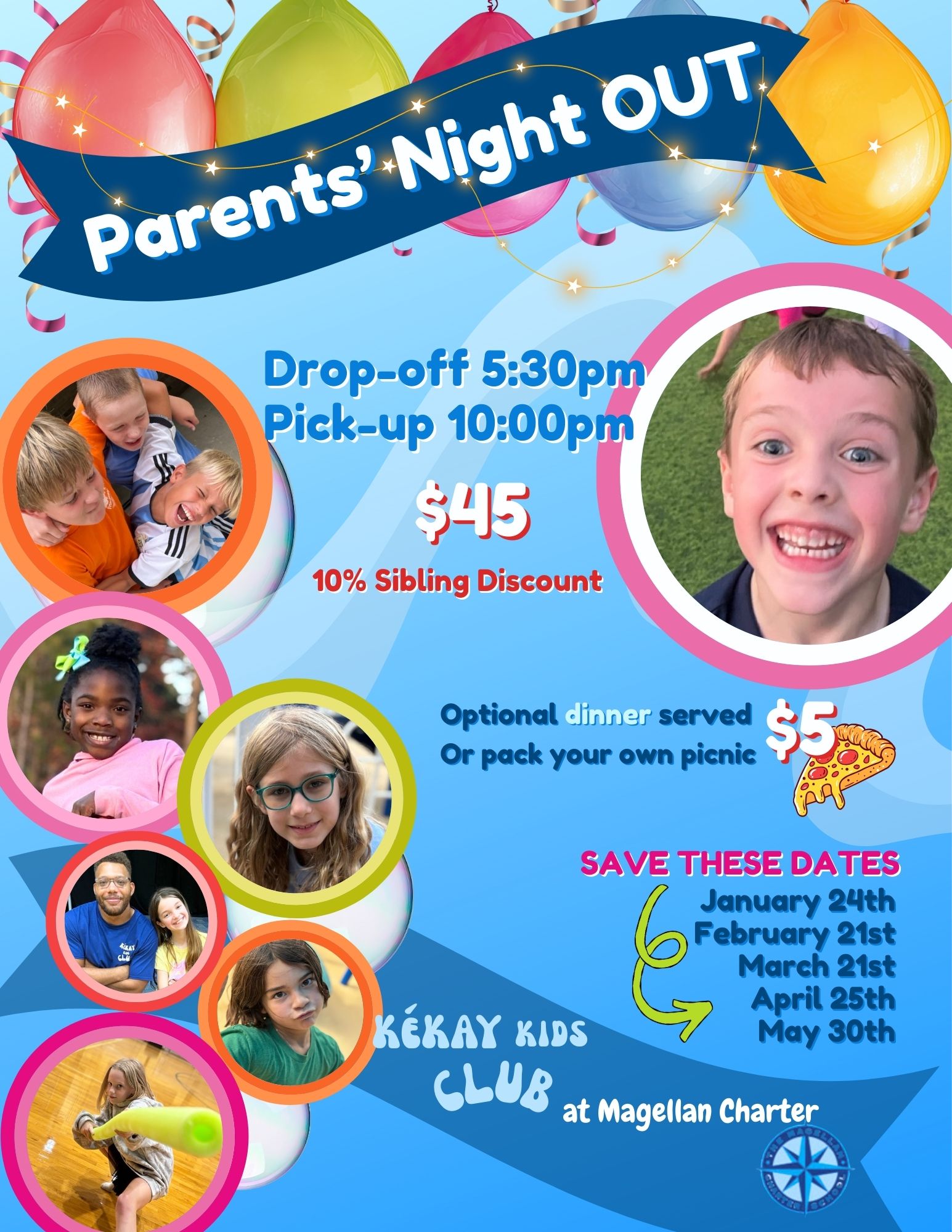 Need a break after the holiday madness? KéKAY Kids Club has you covered! Parents’ Night Out is happening on January 24th, 5:30-10pm right here at Magellan! It’s your ticket to a few glorious hours of grown‑up freedom. Drop the kids off for an evening packed with games, laughter, and all‑around fun (the kind that makes bedtime a breeze), while you enjoy dinner, a movie, or simply… silence. Cost is $45 per student with a 10% discount for siblings. You may choose to add a pizza dinner for your student(s) for $5/each. Click here to claim your spot!